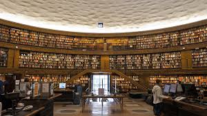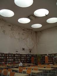 La cubierta de la sala principal presenta incisiones circulares por la que penetra al interior la luz cenital, alrededor de una gran escalera hay una gran mesa de lectura en U, cuyos asientos cenitalmente iluminados pueden ser vigilados desde el servicio de préstamo.