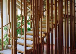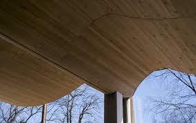 La fachada presenta elementos de madera perpendiculares, ajustados alrededor de las piezas de construcción que están orgánicamente conformadas.