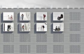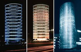 Mientras que aparece sólido durante el día, las estructuras de aluminio perforado se diluyen en la noche mediante el uso de sistemas de luz controlados por ordenador que forman una pantalla interactiva que representa datos medidos, como los niveles de ruido etc.