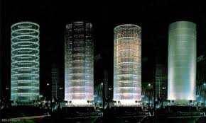 Es autor también de la Torres Fira, esta segunda torre, de planta más tradicional, es completamente de cristal y parece que dentro de ella hubiera alguna estructura de color rojo.