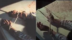 Para la pieza, Mendieta revuelve su apartamento, se cubre de sangre y se ata a una mesa para recrear los momentos posteriores a un ataque sexual violento.