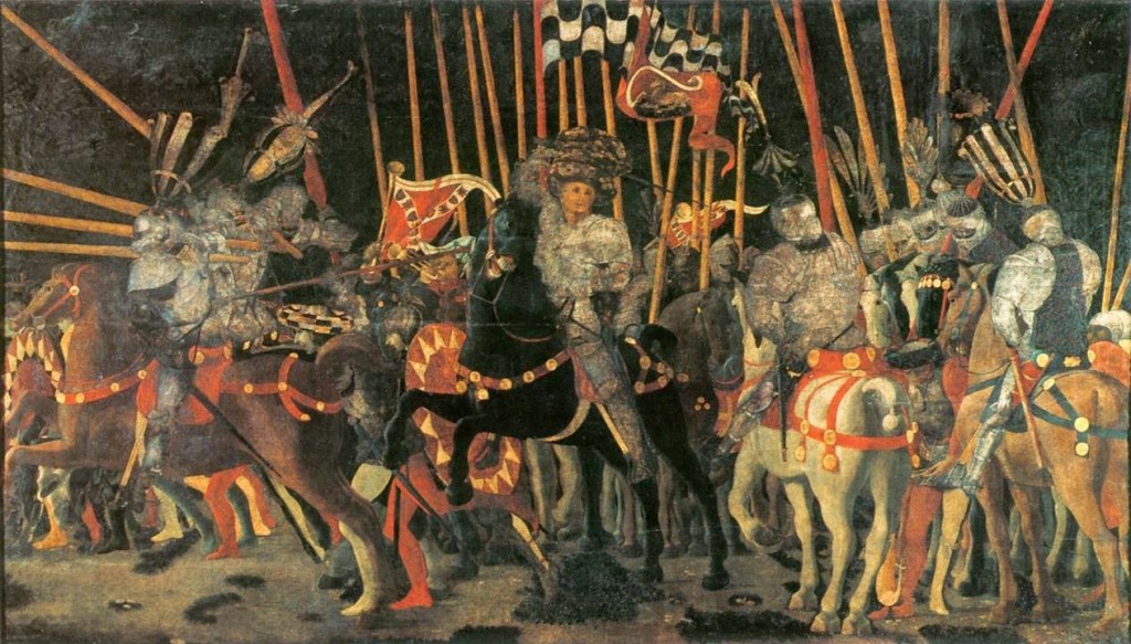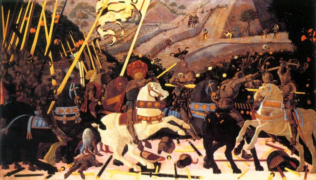 Bernardino Della Ciarda derribado de su caballo. (Galleria degli Uffizi en Florencia). Este es el panel central de las tres pinturas que representan la batalla ganada por Florencia contra Siena en alianza con la familia Visconti que gobernaba Milán. Tuvo lugar el 1 de junio 1432 en San Romano, a medio camino entre Florencia y Pisa. La imagen muestra el combate final entre los capitanes de los dos ejércitos: Niccolò da Tolentino que derriba a Bernardino Della Ciarda.