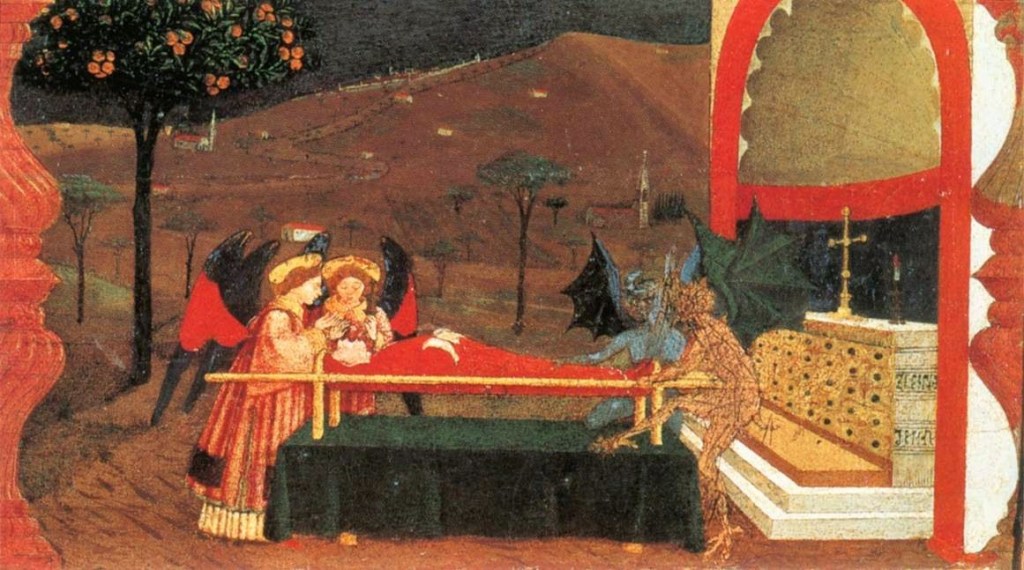 6- Dos ángeles y dos diablos se pelean por el cuerpo de la mujer.