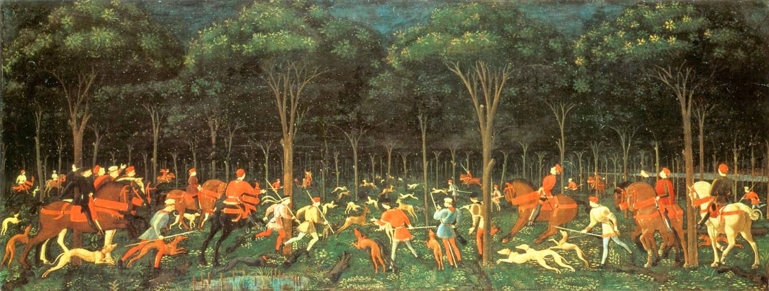 Esta escena de caza es una de las últimas obras de Paolo Uccello. La escena se llama nocturna debido a la extraña luz de luna que cae sobre las elegantes figuritas de los cazadores dispersos por el bosque oscuro.