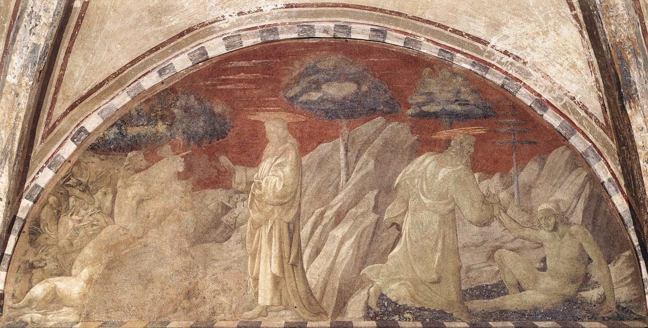 Uccello pinta escenas de la vida de los santos ermitaños en la galería superior del claustro de San Miniato al Monte.