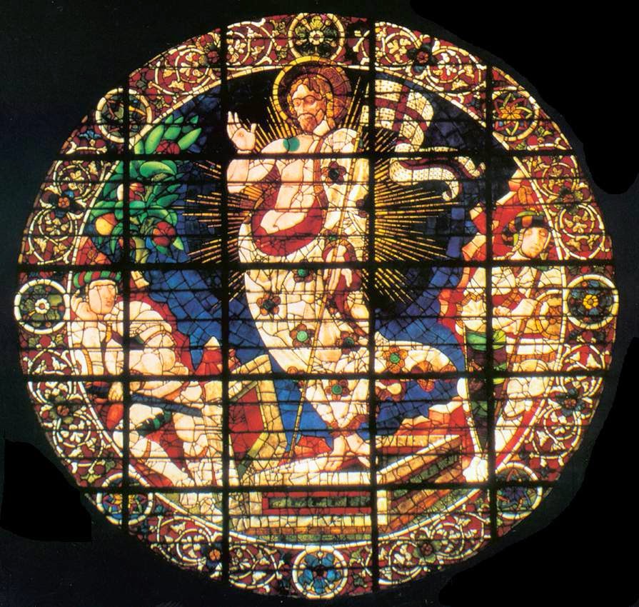 Vidrieras de la Catedral de Florencia: Resurrección y nacimiento de Cristo (1443-1445, vidriera, Catedral de Florencia).