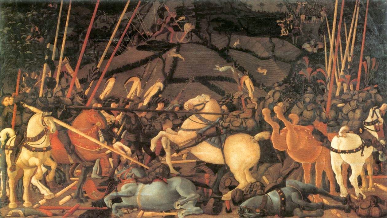 Bernardino Della Ciarda derribado de su caballo. (Galleria degli Uffizi en Florencia). Este es el panel central de las tres pinturas que representan la batalla ganada por Florencia contra Siena en alianza con la familia Visconti que gobernaba Milán. Tuvo lugar el 1 de junio 1432 en San Romano, a medio camino entre Florencia y Pisa. La imagen muestra el combate final entre los capitanes de los dos ejércitos: Niccolò da Tolentino que derriba a Bernardino Della Ciarda.