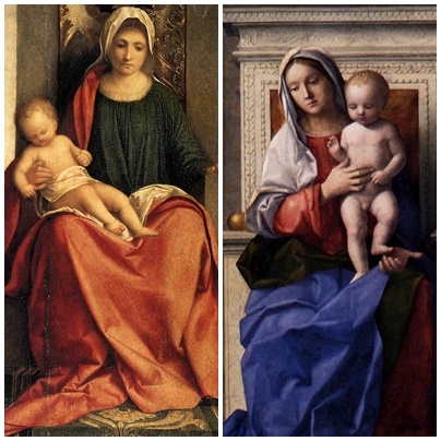 Como ejemplos se muestran dos Virgen con niño y santos, la de la izquierda obra de Giorgione y la de la derecha de Bellini.