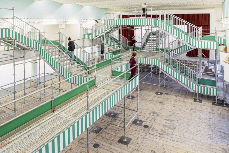 Consta de dos partes, una primera en la que los artistas instalan sus respectivas piezas, mientras por medio de un altavoz se escucha sin interrupción en inglés, español y francés: