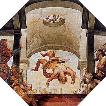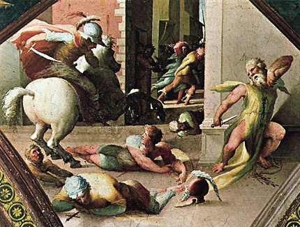 Historia de Publio Mucio, fresco, Domenico Beccafumi (Siena, Palazzo Pubblico)Historia de Publio Mucio, fresco, Domenico Beccafumi (Siena, Palazzo Pubblico)Marco Manlio es arrojado desde lo alto del Capitolio, pintura al fresco, Domenico Beccafumi (Siena, Palazzo Pubblico). Esta escena es a menudo citada por la audacia de su escorzo en perspectiva. El detalle de Marcus Manlio arrojado desde el Capitolio se refiere a un castigo político. Al fondo, los edificios reproducen exactamente la arquitectura visible desde la ventana del Palacio Público situada inmediatamente debajo de la pintura al fresco, como lo demuestran las representaciones de la Piazza del Campo en los siglos XVI y XVII. Así, el espectador podía contemplar dos veces el mismo paisaje urbano bajando la mirada desde el fresco a la ventana. Además, el ciclo se refiere a prácticas penales infligidas en Siena durante la primera mitad del Cinquecento. Marco Manlio es con toda evidencia una figura ejemplar para una república que tenía por costumbre precipitar a los condenados por delitos políticos a través de las ventanas del Palacio, como de hecho lo fue también en Florencia.Reconciliación de Marco Emilio Lépido y Fulvio Flacco, 1529-1535, Domenico Beccafumi (Siena, Palazzo Publico).