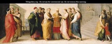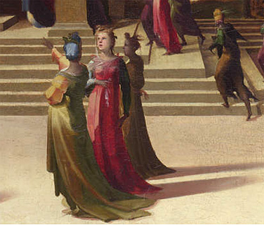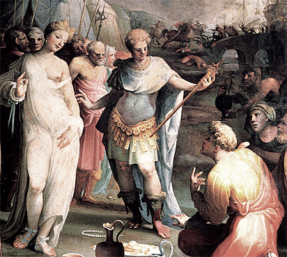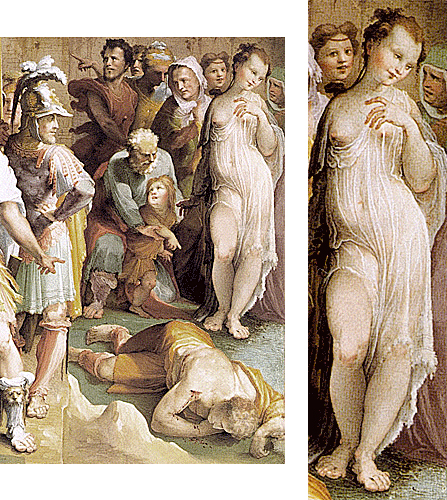 La ejecución de Espurio Melio, fresco, Domenico Beccafumi (Siena, Palazzo Pubblico, Sala del Consistorio). El contrapposto tiene una función narrativa innegable: permite colocar las figuras en varios espacios-tiempo.Figura femenina en grisalla, (Siena, Palacio Público, Sala del Consistorio)Virginia ante Apio Claudio, 1520-1525, óleo sobre tabla, Domenico Beccafumi (Londres, National Gallery). Esta representación de la historia y el mito en un entorno privado es conforme a las costumbres de la época. Es frecuente, especialmente en Siena, que en la decoración de las cámaras nupciales figuren, a modo de ejemplo, las figuras de las antiguas heroínas.Postumio Tiburcio condenando a muerte a su hijo, 1529-1535, Domenico Beccafumi (Siena, Palazzo Publico). De espaldas, un personaje masculino desnudo se apoya en un bastón y levanta el dedo índice; una figura contorsionada de una mujer y con los ojos fijos en la anatomía del cuerpo desnudo, esconde su dedo índice izquierdo en los pliegues de su vestido. El gesto del personaje femenino que forma una línea vertical con el cadáver se redistribuye en las dos figuras femeninas dispuestas detrás de él. Así, el deseo y el objeto del deseo dialogan entre ellos para continuar una «historia» de los efectos producidos por la exhibición de la virilidad. Pero, que relación tiene esta escena con la historia del delito representada en primer plano?El castigo de Coré, 1537-1538, óleo sobre tabla, Domenico Beccafumi (Pisa, Duomo). En primer plano, el amasijo de figuras recuerda a Moisés y las hijas de Jetro de Rosso Fiorentino donde el espacio está saturado por un montón de cuerpos contorsionados medio atrapados en el suelo. La continencia de Escipión, pintura al fresco, 1519, Domenico Beccafumi (Siena, Palacio Bindi Segardi). Al pintor le gustaban los desnudos femeninos hasta el punto de desnudar sus figuras en escenas que no lo requerían. Las variaciones sobre el tema de la continencia de Escipión muestran como la prometida se representa a veces desnuda o vestida. En el fresco del palacio Bindi Segardi, la clemencia de Escipión el Africano es tanto más loable que el desnudo femenino es inquietante. Beccafumi irá desgranando así sus desnudos femeninos, incluso a costa de alterar la historia.