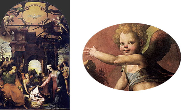 Natividad, h. 1522, Domenico Beccafumi (Siena, iglesia de San Martino). El uso de colores, típico de la «maniera» de Pontormo o de Rosso, provoca un choque visual tan intenso que los efectos cromáticos se incrementan por el comportamiento de la luz. Ya no se trata de restituir zonas luminosas y sombreadas según las necesidades de la composición, sino de hacer vibrar el colorido, incluso de metamorfosearlo.