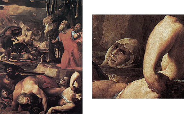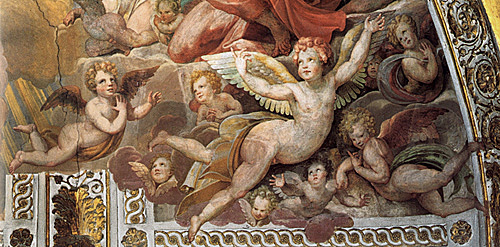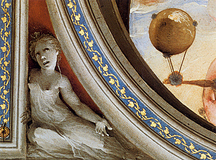 Gloria de los ángeles, detalle, Domenico Beccafumi (Siena, Duomo). En esta parte del fresco, el pintor ha representado un querubín cuya distensión en el abdomen y las nalgas intumescentes no deja de sorprender al espectador acostumbrado a una versión seráfica del mundo celestial. Por otra parte, el pintor utiliza regularmente la línea serpentina para construir sus figuras, ya sean sagradas o profanas.