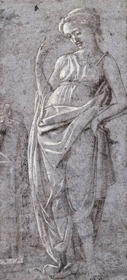 Madonna con el Niño” (1430’, temple sobre tabla, Palazzo Medici-Riccardi, Florencia). La Virgen se nos muestra nostálgica y un poco melancólica, al tiempo que la forma pesada y musculosa del bebé nos recuerda a las figuras tridimensionales de Masaccio. Pero Masaccio había utilizado la luz direccional para revelar las formas de sus figuras, y La Virgen y el niño de Lippi, por el contrario, se bañan en un resplandor general que impide que el modelado de las figuras pierda la línea elegante y bien definida de su composición. Conforme la confianza de Lippi crece la influencia de Masaccio disminuye. Figura Femenina” (1430’, lápiz y tinta sobre papel azul, Harvard University Art Museum, Cambridge, Mass., EEUU). No encontramos ante uno de los bocetos realizados por Lippi para una de sus obras, probablemente una profetisa.