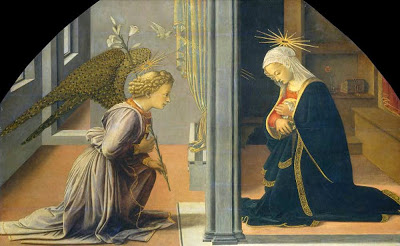 La Anunciación” (1435-1440, temple sobre tabla, National Gallery of Art, Washington, EEUU). Esta es una primera versión del tema de la Anunciación que Fra Filippo Lippi trató en varias ocasiones a lo largo de su carrera. Lippi muestra las figuras atrapadas en un eje diagonal de luz que cae sobre la espalda del ángel e ilumina a la Virgen tras pasar a través de un arco abierto entre las dos figuras y que se encuentra detrás de una pilastra con columnas adosadas. La división bilateral de la Anunciación mediante un elemento arquitectónico es un sello distintivo de las representaciones de la Anunciación en el Renacimiento.