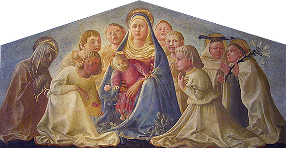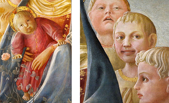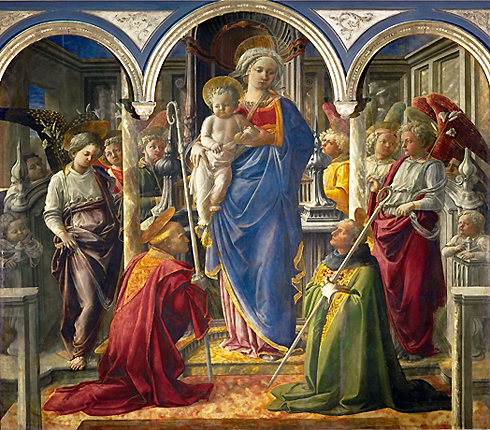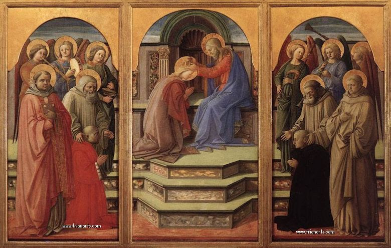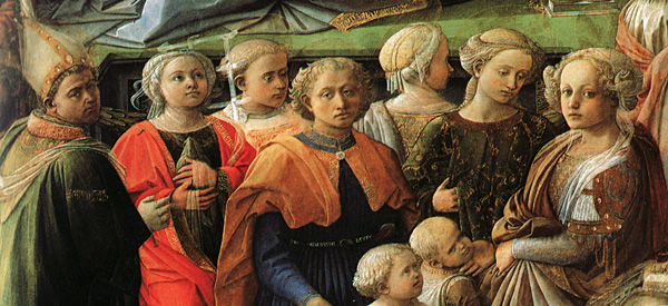 Coronación de la Virgen, 1443-1447, Filippo Lippi (Florencia, Museo de lo Oficios). Este cuadro presenta una composición revolucionaria, y no sólo por los elementos iconográficos que contiene. Si en los retablos con temas análogos, este episodio era representado bañado en una atmósfera celestial, aquí en cambio, aunque Lippi desarrolla el tema de la llegada de la Virgen al cielo, sitúa el relato como en una gran escena de teatro, con personajes tangibles, de carne y hueso, siempre realistas.Las figuras de Lippi parecen cruzar sus miradas con el espectador, según un procedimiento teorizado por Leon Battista Alberti en su Tratado de Pintura.