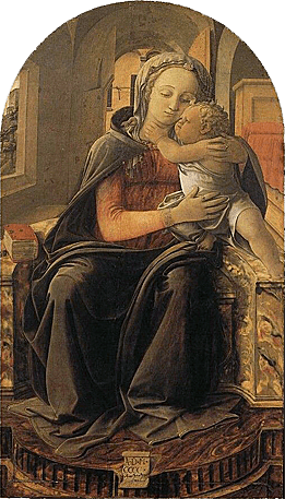 La Virgen y el Niño con ángeles y santos, 1430, Filippo Lippi (Émpoli, Museo de la iglesia de la Colegiata). Esta deliciosa pintura sobre tabla fue encargada probablemente por los Carmelitas del convento de Selva, cerca de Florencia. Representa a la Virgen en el trono entre ángeles y los santos Miguel, Bartolomé y Alberto. Antaño atribuida a Masaccio, a Masolino e incluso a Andrea del Castagno, la tabla pone de manifiesto que Filippo Lippi conocía las obras de aquel primer gran intérprete de la lección de Masaccio, que fue Fra Angelico. El colorido brillante y ciertas preciosidades de inspiración casi flamenca en los relieves del trono y en la luz suave, pero sobre todo, la disposición circular de los personajes recuerda el Tributo de Masaccio.Virgen de la Humildad (Virgen de Trivulzio), hacia 1432, Filippo Lippi (Milán, Museo del Castello Sforzesco). En esta obra llama la atención la composición extraordinariamente incisiva, casi teatral o fotográfica, de las caras de los niños que rodean a la Virgen, como si estuvieran inmortalizados en una instantánea, en especial aquellos situados detrás, que levantan sus caras para no ser tapados por los que están en primer plano;el Niño Jesús, un niño bullicioso que quiere escabullirse de los brazos de su madre, una Virgen joven con rasgos de mujer del pueblo, con la mirada distraída fijada en un punto lejano y que ignora al espectador.La Virgen y el Niño, (Madonna de Corneto Tarquinia), 1437, Filippo Lippi (Roma, Galleria Nazionale d’Arte Antica). Esta Virgen, nos presenta una imagen reforzada por un sentido del contorno dinámico heredado de Donatello; la imagen surge de un fondo que representa un interior dentro de una luz rasante y un poco oscura que nos recuerda la pintura flamenca. La obra lleva la fecha de 1437 en la viñeta colocada sobre el zócalo de un refinado trono de mármol jaspeado. Si la posición de las piernas de este Niño adorablemente mofletudo, indica claramente la inspiración del arte antiguo, la disposición de este interior, con el trono en abanico, el jardín que se vislumbra por la ventana abierta a la izquierda, el patio que se percibe a través del portal entreabierto en segundo plano, hacen pensar inmediatamente en lo que Jan van Eyck y los flamencos en general, pintaban desde hacía algún tiempo.a Virgen y el Niño con ángeles y santos, (Retablo Barbadori), 1437-1438, Filippo Lippi (París, museo del Louvre). La gran innovación de este retablo, además de la dosificación magistral de la luz – difusa, atmosférica – consiste en la concepción misma de la escena, la cual parece desarrollarse en una atmósfera real, extremadamente refinada. En segundo plano, a la izquierda, en el muro enriquecido con paneles de mármol veteado, se entrevé una ventana abierta, y a través de la ventana un verdadero cielo con nubes. Filippo muestra una particular sensibilidad hacia los más actuales elementos iconográficos.
