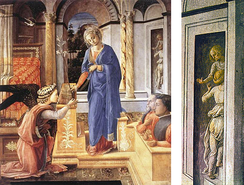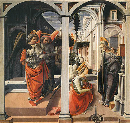 La Anunciación, 1440-1442, Filippo Lippi (Florencia, iglesia San Lorenzo). En esta obra, la escala de la perspectiva no presenta ninguna unidad; se trata de una multiplicación de escalas que dilatan el espacio hacia el fondo, en un intenso distanciamiento panorámico. En primer plano, subrayado por un pavimento a varios niveles, que corresponden a los distintos personajes, el ojo del espectador es atraído a la izquierda por dos ángeles «suplementarios»; se trata de dos figuras superfluas desde un punto de vista iconográfico o narrativo, pero que, junto a otros detalles que la imaginación del artista ha dispuesto en el paisaje, enriquecen la composición y la escenografía. La espléndida vasija transparente, símbolo de la Virginidad de María, es un detalle que por sí solo ya es una naturaleza muerta.