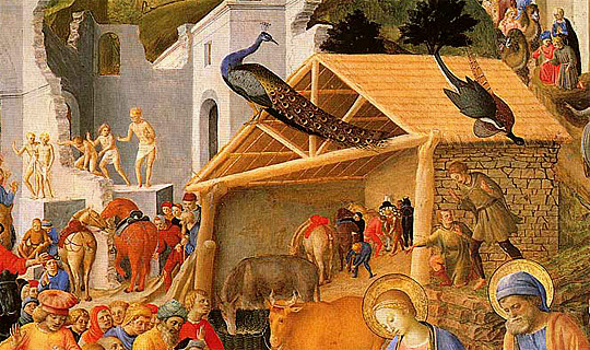 La Adoración de los Magos, detalle, Filippo Lippi (Washington, National Gallery of Art). Esta obra contiene tanta variedad de elementos que incluso deberían analizarse sus símbolos más secretos (como los personajes medio desnudos que se encuentran sobre las ruinas del edificio, hacia el fondo, los cuales podrían ser citaciones de estatuas antiguas). También, y dada la dificultad de situarla cronológicamente, unas veces la obra ha sido atribuida a Lippi y otras a Fra Angelico, e incluso a una colaboración entre ambos maestros. En todo caso, tuvo que revestir una gran importancia en Florencia, ya que se conoce una obra de Domenico Veneziano sobre el mismo tema, retomado varias veces por Botticelli.