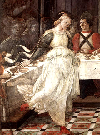 Episodios de la vida de san Juan Bautista: Banquete de Herodes, Filippo Lippi, (Prato, Catedral). En la escena del Banquete de Herodes, como también en todas las demás escenas del ciclo de Prato, la disposición escénica es particularmente compleja e imponente, rica en personajes representados en las más variadas poses, a menudo en oposición entre ellos.