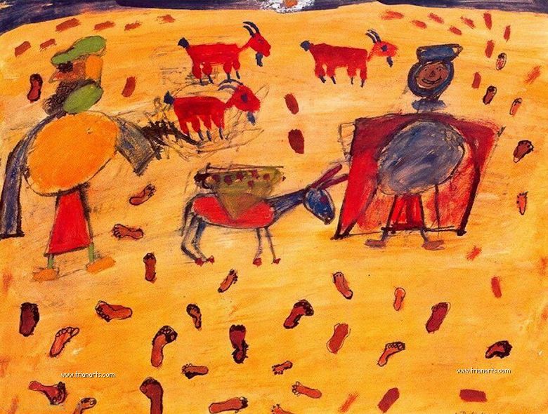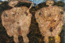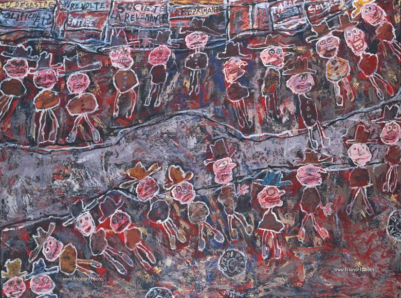 Se inspira en los dibujos de los niños, criminales y dementes, personajes bufos, morbosos, como las mujeres de su serie DAMES o seres infrahumanos, figuras deformes, absurdas y grotescas, como los ciclos BARBAS.