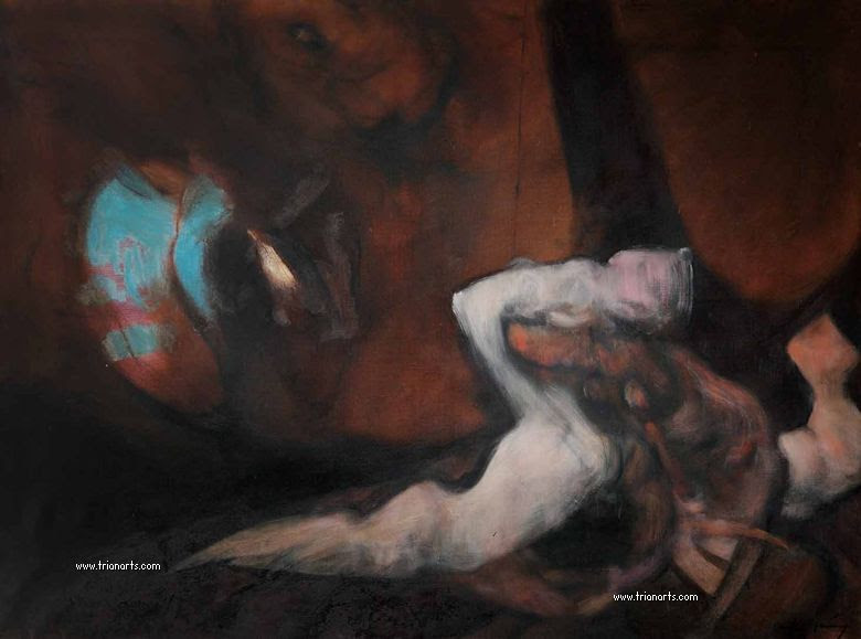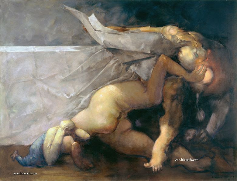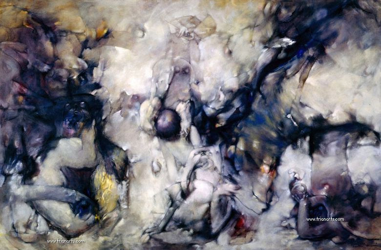 Estas piezas son confeccionadas sobre superficies fracturadas de formas entrelazadas, algunas con formas humanas, otras biomórficas, envueltas por velos traslúcidos de pintura.