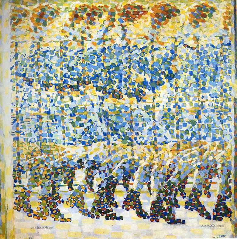 1913 su pintura evoluciona hacia la abstracción, la representación de la descomposición del desplazamiento da paso a estructuras espirales y el estudio del movimiento al análisis de la descomposición de la luz.