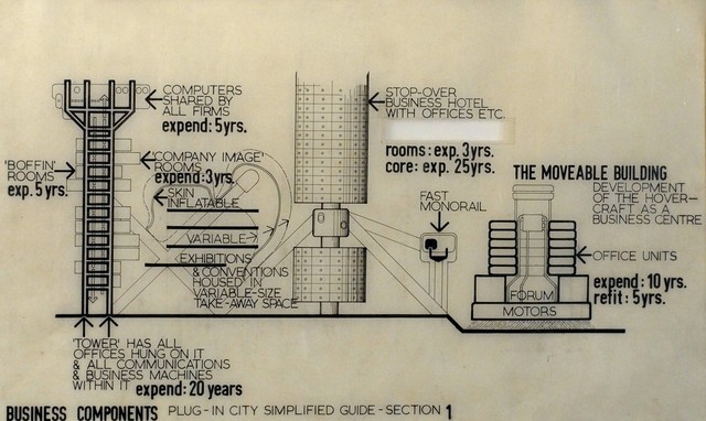 La ciudad enchufable esta coronada con grúas para mostrar que esta en un estado de flujo continuo.