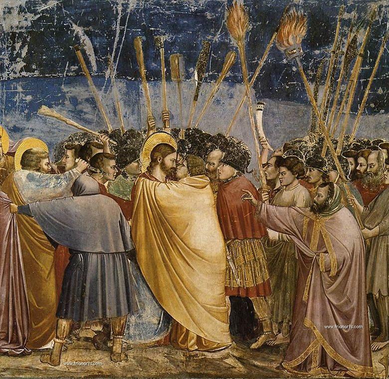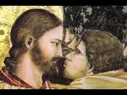 El beso de Judas a Cristo comporta un abrazo que insinúa un encuentro bucal entre ambos.