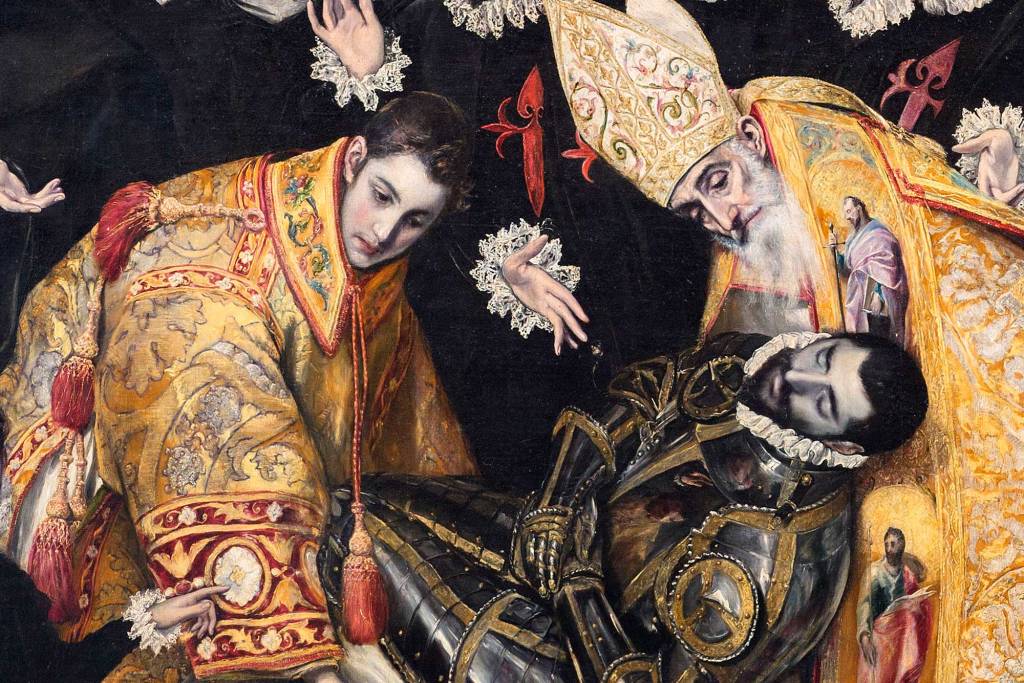 San Agustin y San Esteban toman en sus brazos como una pluma al difunto señor de Orgaz y lo sostienen a pesar de llevar una armadura.