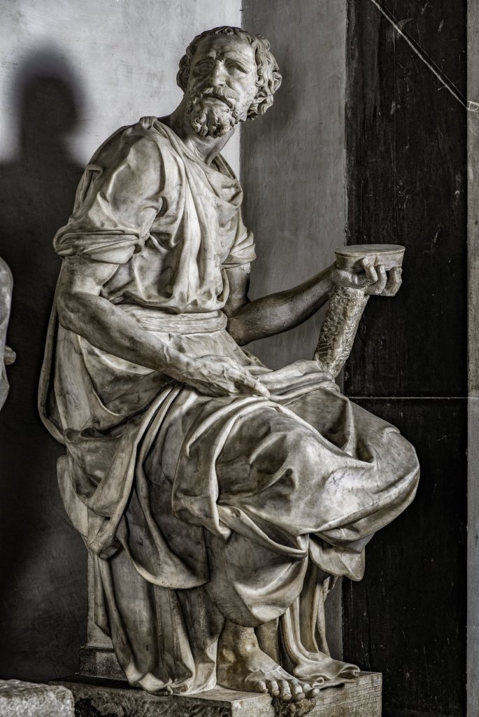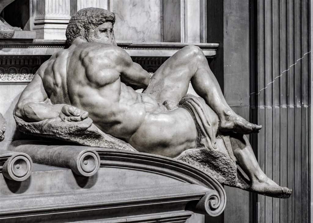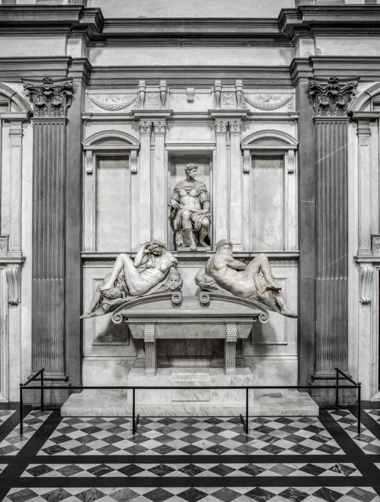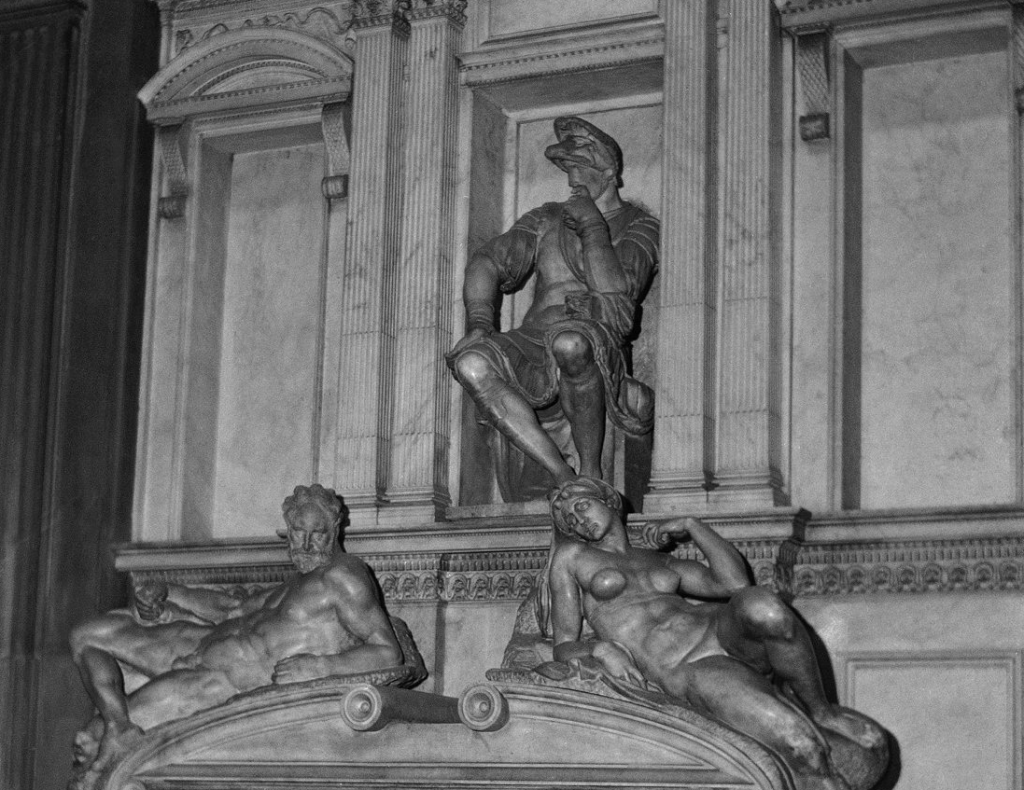Cuando el Papa Julio II encargó a Miguel Ángel, en 1505, la realización de su monumento funerario, poco podía imaginar el artista que sólo podría dar conclusión a su obra cuatro décadas más tarde cuando el Papa ya había fallecido. Fue éste uno de los proyectos más ambiciosos del genio florentino, concebido por él mismo como su gran obra. Sin embargo, tras numerosos contratiempos, incluido el despido y posterior readmisión del artista por parte del Papa, la obra nunca llegó a convertirse en el proyecto inicial. La imagen muestra la parte baja de toda la estructura –compuesta por dos niveles–, cuyo centro lo ocupa una estatua Moisés. El conjunto del sepulcro fue instalado en San Pietro in Vincoli, Roma.
