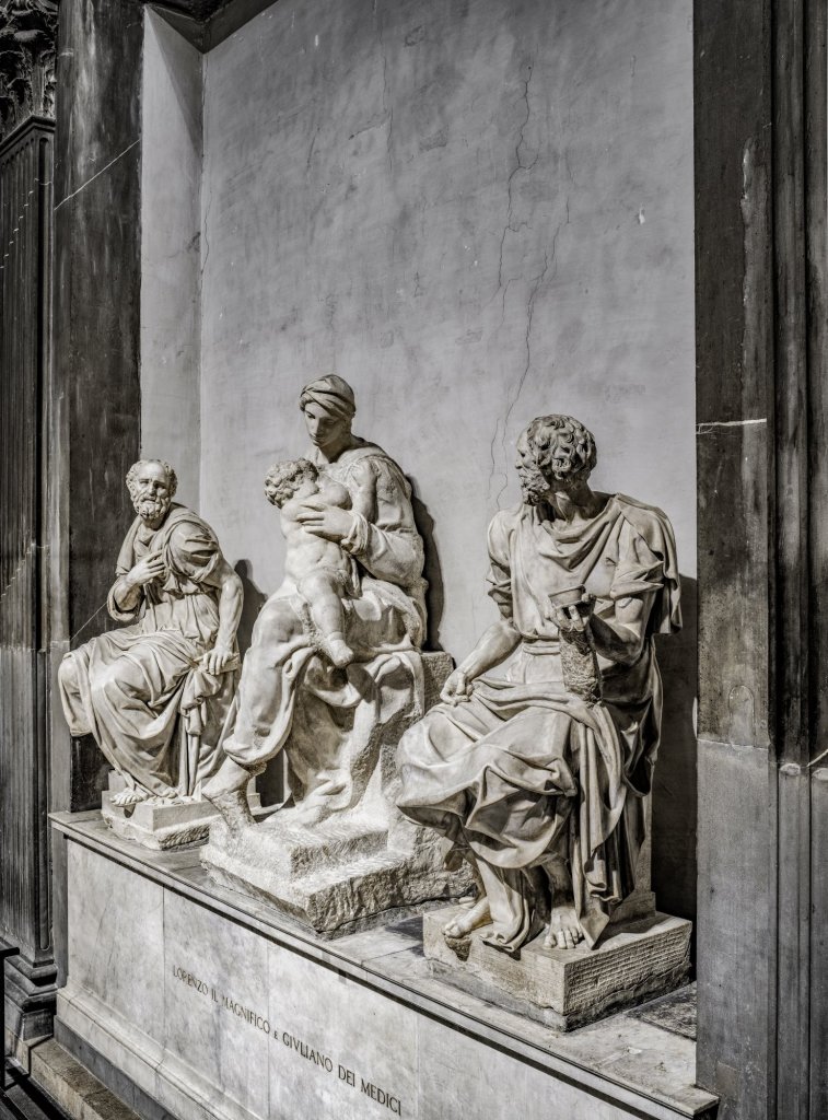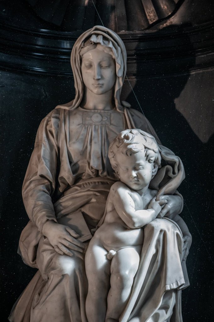 Justo después de terminar la Piedad y antes de comenzar el David, Miguel Ángel realizó esta escultura que se encuentra en la iglesia de Nuestra Señora de Brujas, en Bélgica. Perteneciente al periodo clasicista del artista, la Madonna de Brujas exhibe la contención típica de este estilo. Su belleza reside precisamente ahí, en la armonía entre las partes que la forman y en una expresión equilibrada que no perturba los rasgos de los protagonistas. La escultura fue terminada en 1504, antes de que las esculturas de Miguel Ángel experimentaran el cambio evidente que se aprecia en el David o el Moisés.