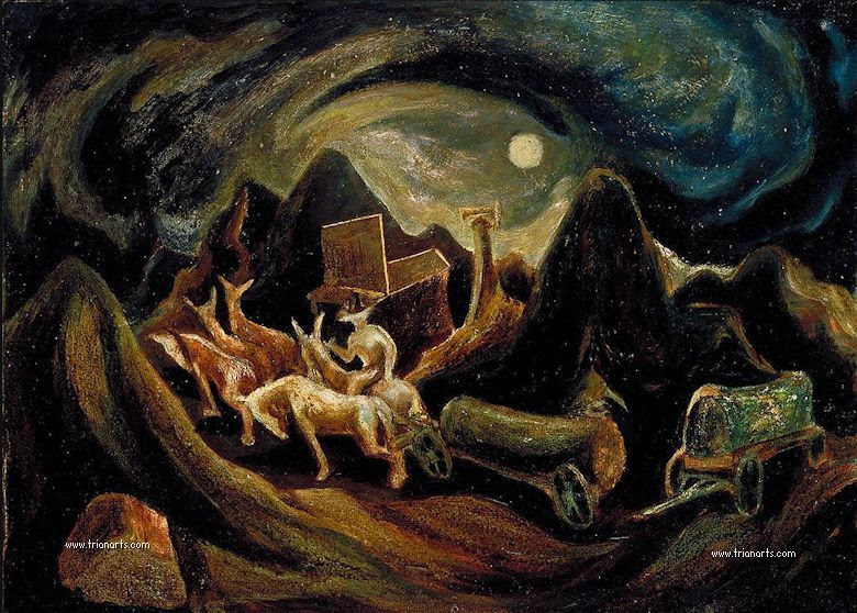 Los primeros lienzos de Pollock son figurativos, representan escenas del mundo rural de EEUU, dotadas de cierta turbulencia enérgica.