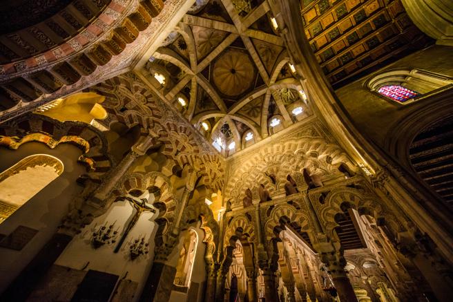 La mezquita que hoy es una catedral se caracteriza por una gran sala hipóstila de 856 columnas rematadas por arcos dobles que alternan piedra blanca y ladrillo rojo.