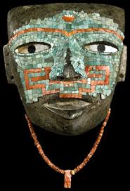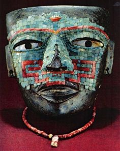La máscara de tamaño natural que muestro aquí esta hecha de piedra, obsidiana, coral, turquesa y conchas.