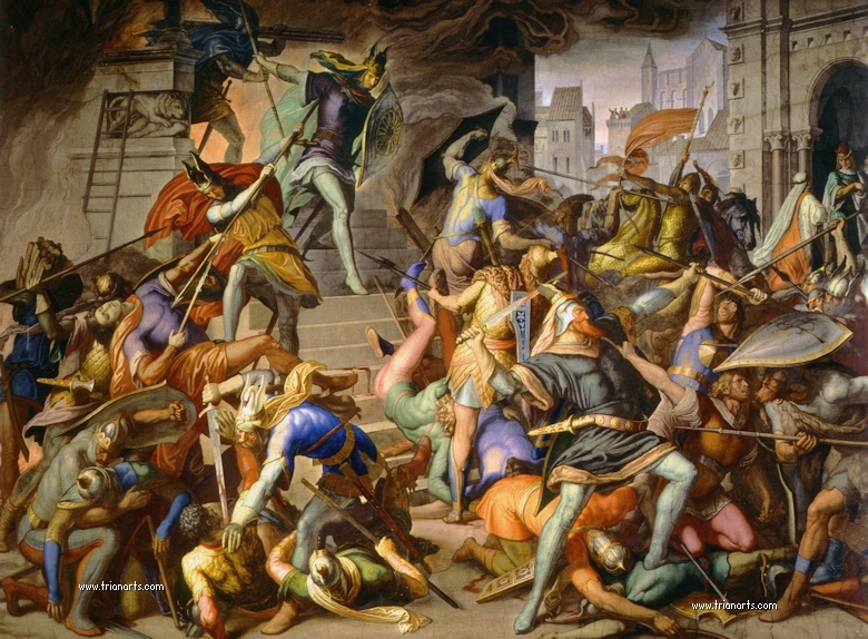Para no caer preso del enemigo, hizo instalar en su palacio una gigantesca hoguera en la cual puso su oro, su plata y todas sus posesiones de monarca; se encerró con sus mujeres y sus eunucos en un espacio habilitado en medio de la hoguera, dejándose así quemar con su gente y su palacio