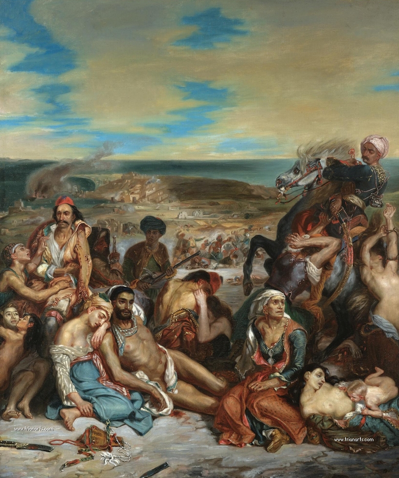 El cuadro representa una escena de ruina y desesperación tras la masacre de la isla griega de Quios, donde las tropas otomanas matan a 20000 personas durante la guerra de independencia griega.