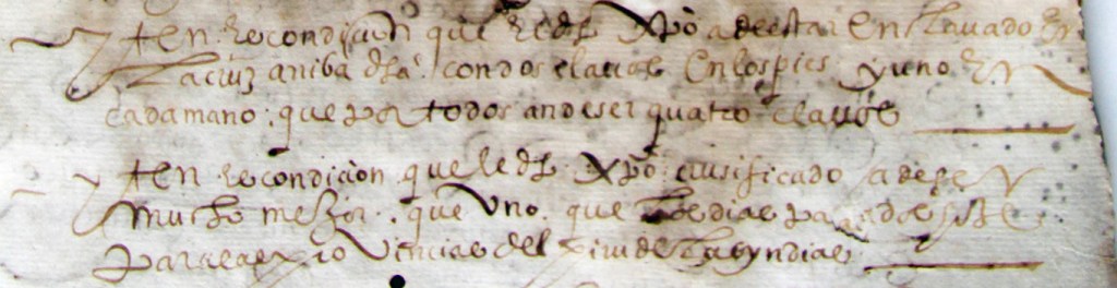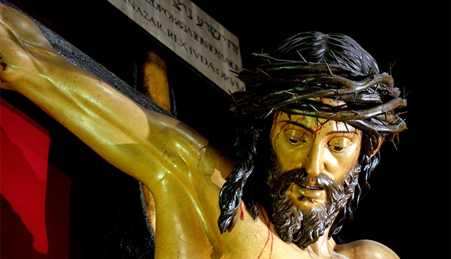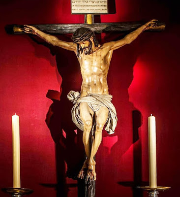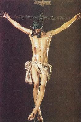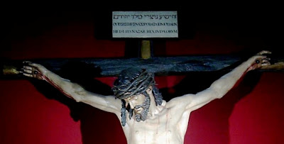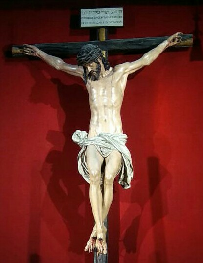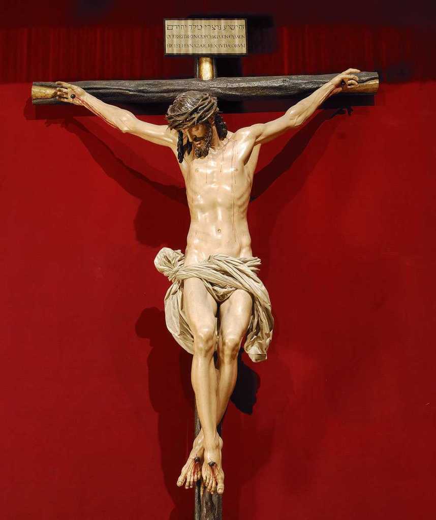 Debe mostrar a Cristo vivo en el momento antes de expirar, con la cabeza inclinada hacia la derecha, mirando a aquel que esta rezando a sus pies de manera que parezca que Cristo se dirige a él, diciéndole que es por él por quien sufre.