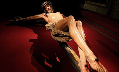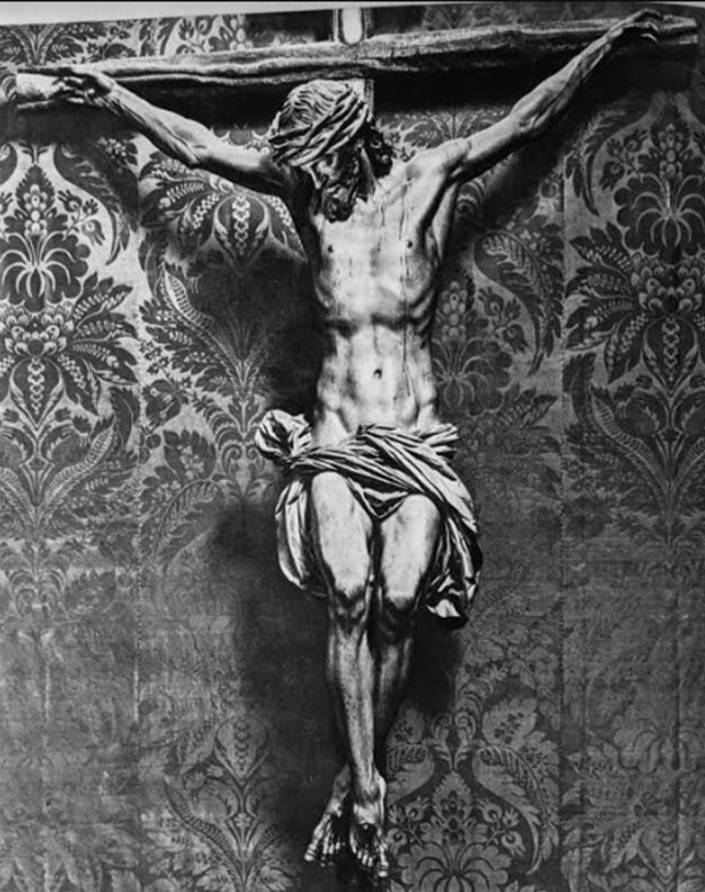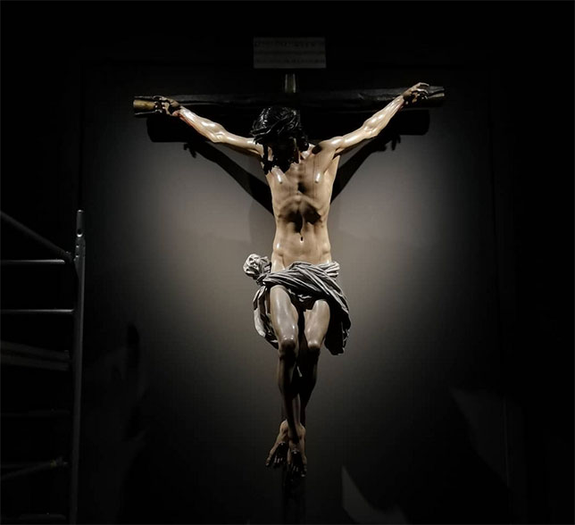 De esta forma la figura de Cristo parece flotar ante la cruz, más que colgar de ella.