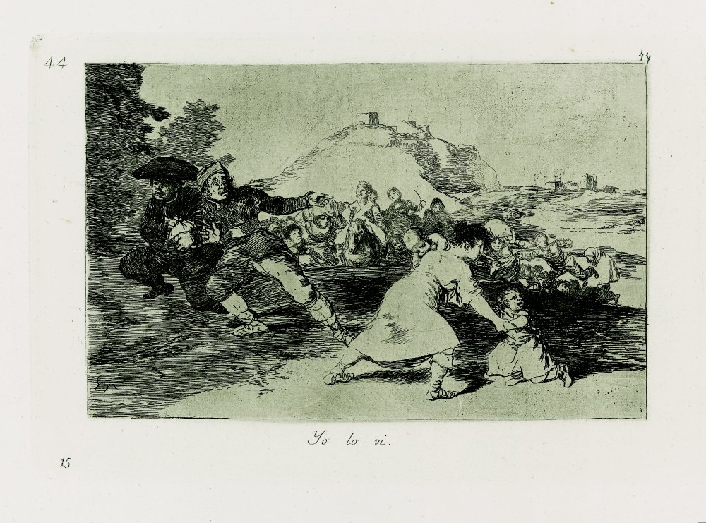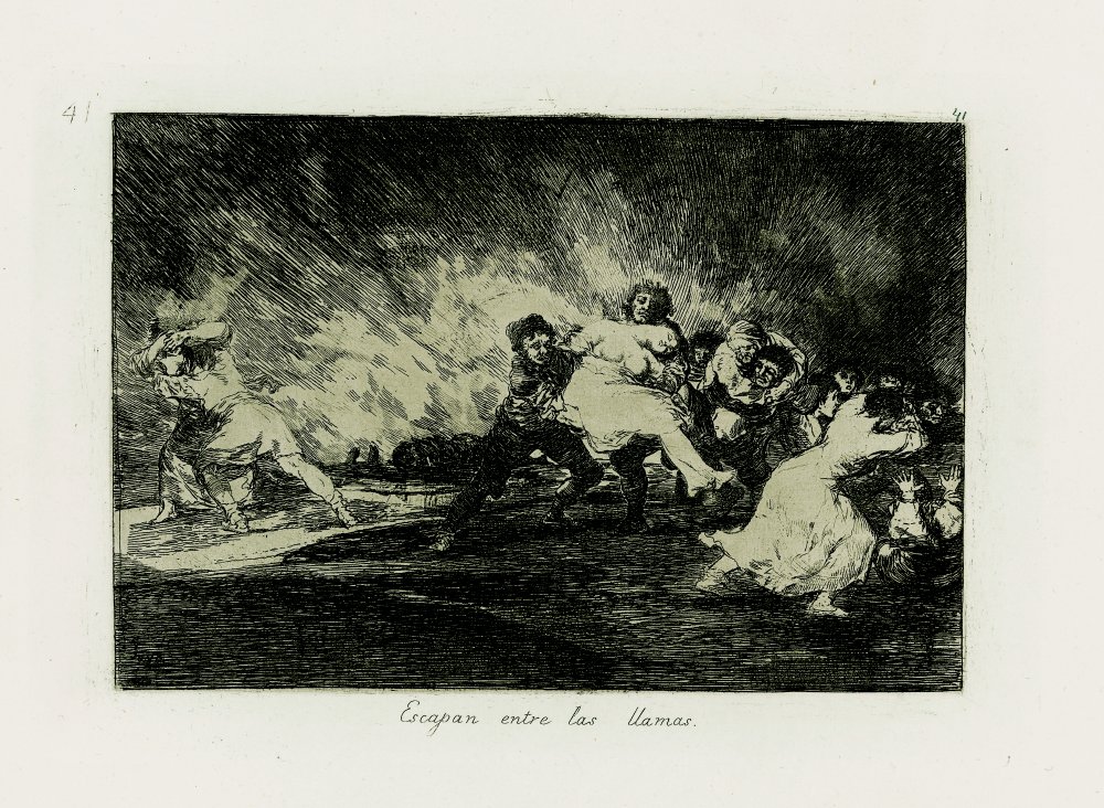 En Yo lo vi, plancha 44, madre e hijo huyen de un enemigo invisible y en No se puede mirar, plancha 26, unas siluetas vuelven la cabeza ante un haz de bayonetas que los apuntan amenazantes.