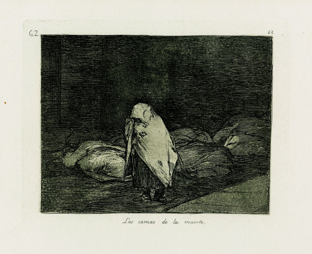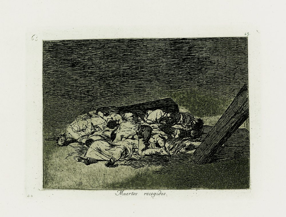 Goya por su parte la muestra con sencillez aparece de espaldas, apenas silueteada, de pie sobre una pila de cadáveres.