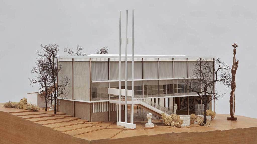 El edificio de la Fondation Maeght en Saint Paul de Vence de 1964 engloba su arquitectura con las artes visuales que tanto inspiraban a Sert. Un entorno en constante conversación con la naturaleza y el Mediterráneo como telón de fondo.Miró y Sert estudian juntos la maqueta de la Fondation Maeght. Su amistad se prolongará durante décadas con una profunda admiración mutua: en sus edificios Sert solamente utilizará la paleta de colores de Miró.
