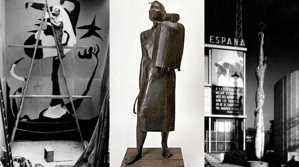 El estadounidense Alexander Calder fue el único artista no español con obra en el pabellón. Su Fuente de mercurio, una escultura móvil que incluye el texto “Almadén” escrito en alambre, subrayaba la dimensión económica de la Guerra Civil.La premura de tiempo llevó a Lacasa, más afín al llamado regionalismo castellano que al “simplismo de Le Corbusier”, a desechar su primera idea: construir “a la española”, es decir, con piedra y ladrillo. La experiencia de Sert con estructuras vistas y módulos prefabricados fue decisiva para levantar, “en seco” y a toda velocidad, un edificio de planta libre cuya primera piedra se colocó el 27 de febrero.El arquitecto y diseñador Josep Torres Clavé creó para el pabellón una butaca de madera con respaldo de cuerda inspirada en la sillería ibicenca. La empresa Mobles 114 la sigue produciendo.La obra de Sert y Lacasa se convirtió ella misma en pieza destacada de aquella antología de la arquitectura, el diseño y las artes plásticas marcada por el Guernica, pero engrosada también por obras hoy clásicas: un mural pintado in situ por Joan Miró en el rellano de la escalera ( El segador), una butaca diseñada por Josep Torres Clavé y esculturas tan icónicas como El pueblo español tiene un camino que conduce a una estrella, de Alberto Sánchez; La Montserrat, de Julio González (Gaos la prefirió a la abstracta Mujer ante el espejo , otro icono), o la fuente de mercurio de Almadén de Alexander Calder, el único artista no español de la muestra. Y envolviéndolo todo, los fotomurales del cartelista Josep Renau, que durante la guerra ejerció como director de Bellas Artes.A la espalda del ‘Guernica’, fuera del pabellón, Picasso expuso una copia en cemento de la escultura ‘Dama oferente’ de 1933 (en la imagen, a la izquierda). Picasso cedió además varios grabados y esculturas, como la cabeza de mujer, a la derecha, que se colocó a la entrada del pabellón.El 25 de noviembre, la Exposición de París cerró sus puertas y comenzó el precipitado desmontaje de la sede española. El Guernica inició un viaje que no le traería a España hasta 1981 y el mural de Miró se perdió para siempre. En 1992 una versión del pabellón se levantó en La Vall d’Hebron (Barcelona) y desde 2001 una copia de la escultura de Alberto Sánchez ocupa la plaza del Reina Sofía. Muchos de los protagonistas de aquellos meses de 1937 murieron en el exilio.A la izquierda, Joan Miró pintando in situ su ‘Pagès catalá en rebel·lió’, un mural de 5 metros conocido también como ‘El segador’. Desmontado el pabellón en noviembre de 1937, la obra terminó perdiéndose para siempre. En el centor, ‘La Montserrat’, del barcelonés Julio González, que utilizó un lenguaje más realista en esta escultura de una campesina catalana con un niño en brazos y una hoz en la mano (actualmente, en la colección del Museo Stedelijk, de Ámsterdam). A la derecha, ‘El pueblo español tiene un camino que conduce a una estrella’, de Alberto Sánchez. La escultura —de 12,5 metros— , es una proclama vanguardista frente al compromiso político ligado al realismo. Hoy se encuentra en la plaza del Museo Reina Sofía.Taller Sert. En 1957 Sert concibe un taller en Mallorca para su gran amigo Miró, donde la obra arquitectónica busca ante todo responder a las necesidades del artista que regresa a sus raíces en la isla, tanto su madre como su esposa tienen sus orígenes en Mallorca.En el interior del Taller Sert parece como si el tiempo se hubiera detenido. Junto a los pinceles, lápices o paletas del artista, aparecen elementos de su universo personal y creativo: piedras, recortes o siruells mallorquines que acompañaban e inspiraban a Miró en el día a día.