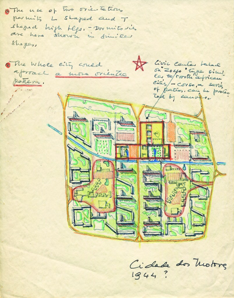 Croquis de la Ciudad de Motores (1944) proyectada por Sert en Brasil. A lo largo de los años proyectaría diversos planos urbanísticos para Sudamérica, explorando las ideas de urbanismo que más tarde recuperaría en su labor docente en Harvard y que a su vez han servido como punto de inicio para el trazado de otras ciudades posteriores.