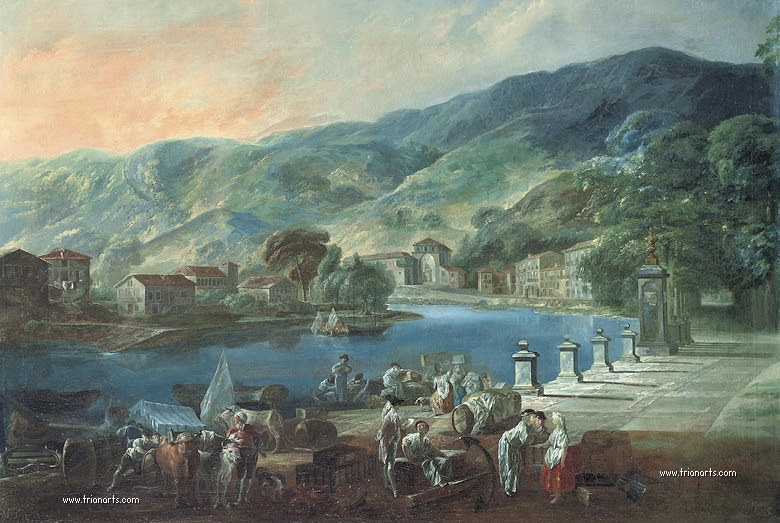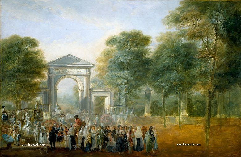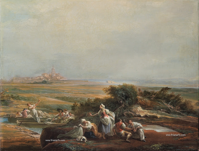 Además, el empaste que toma de su maestro De la Traverse, su pintura muestra temas y formas de Watteau, como de la siguiente generación de pintores galantes franceses, como Boucher y Fragonard, algo que lleva al paisaje de Carl Joseph Vernet.