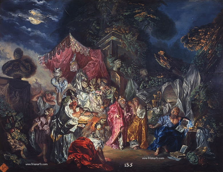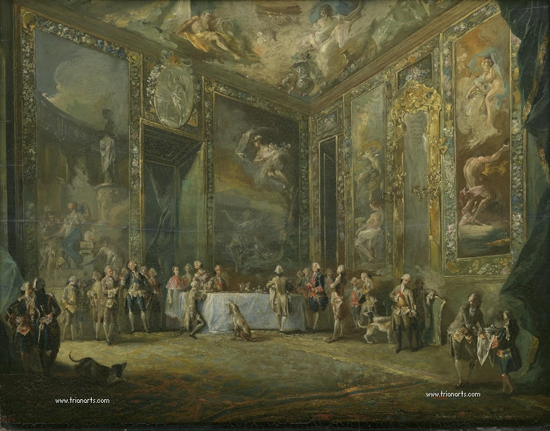 De cualquier manera, una de sus piezas mas interesantes es Carlos III comiendo ante su corte, pintura de ampulosa escenografía, llena de detalles interesantes.