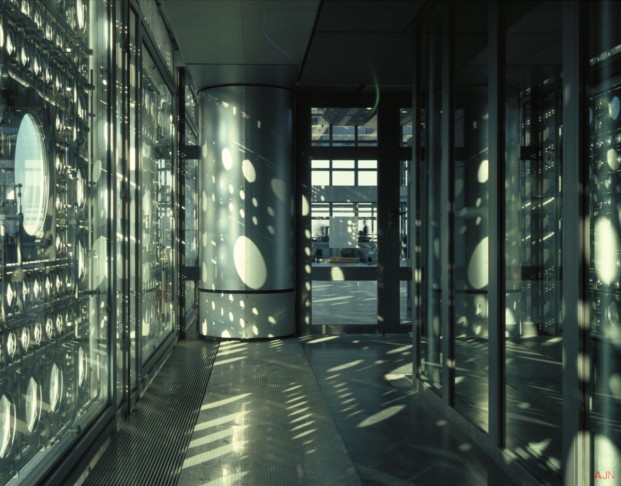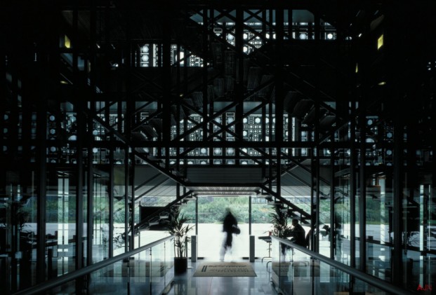 Los diafragmas de la fachada de este edificio de cristal se pueden controlar con un mando para regular la entrada de luz.