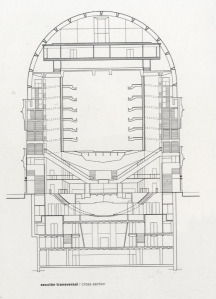 El fino tejado es acusado saledizo y líneas angulosas protege del sol las fachadas de este edificio dividido en tres secciones, la Filarmónica, el Pabellón de Arte y el Pabellón de Eventos.