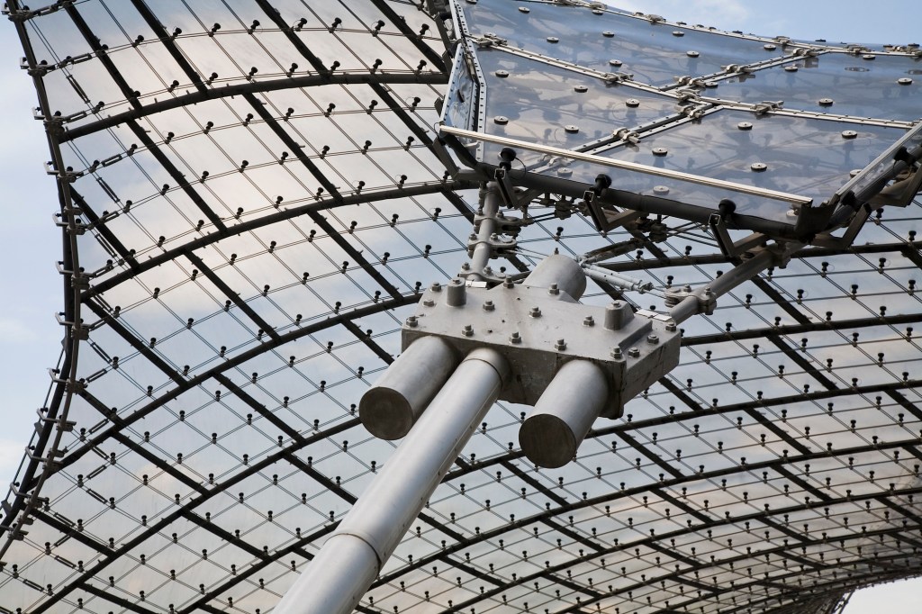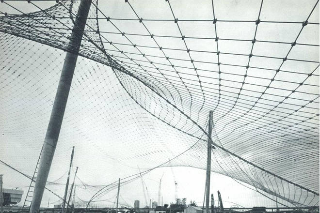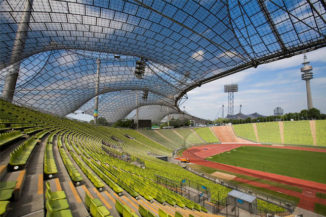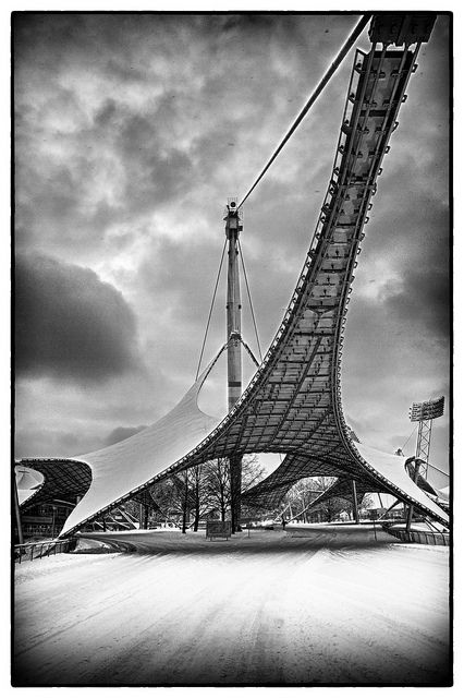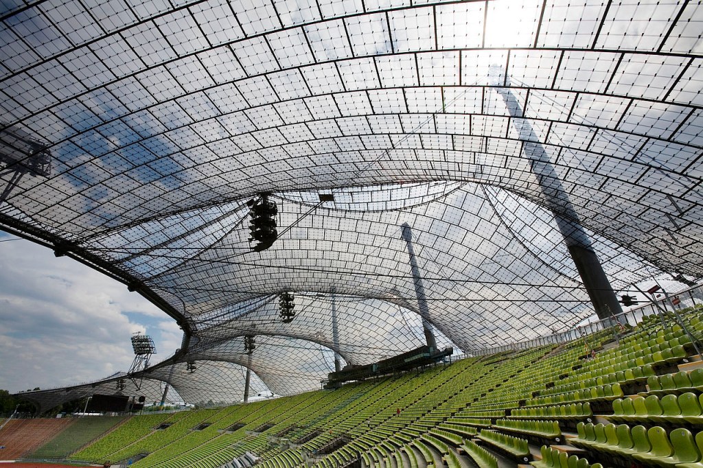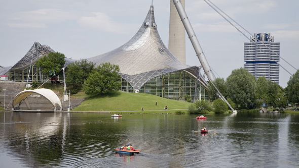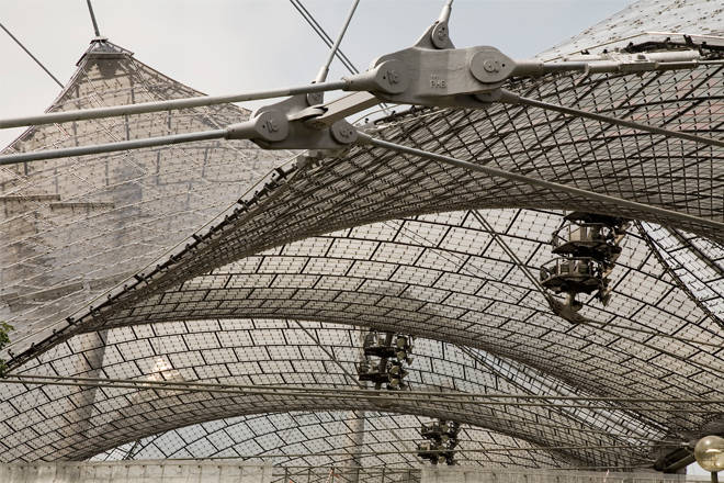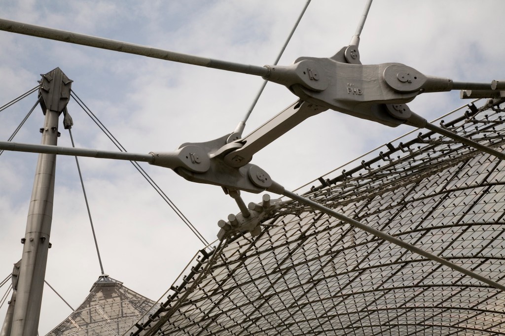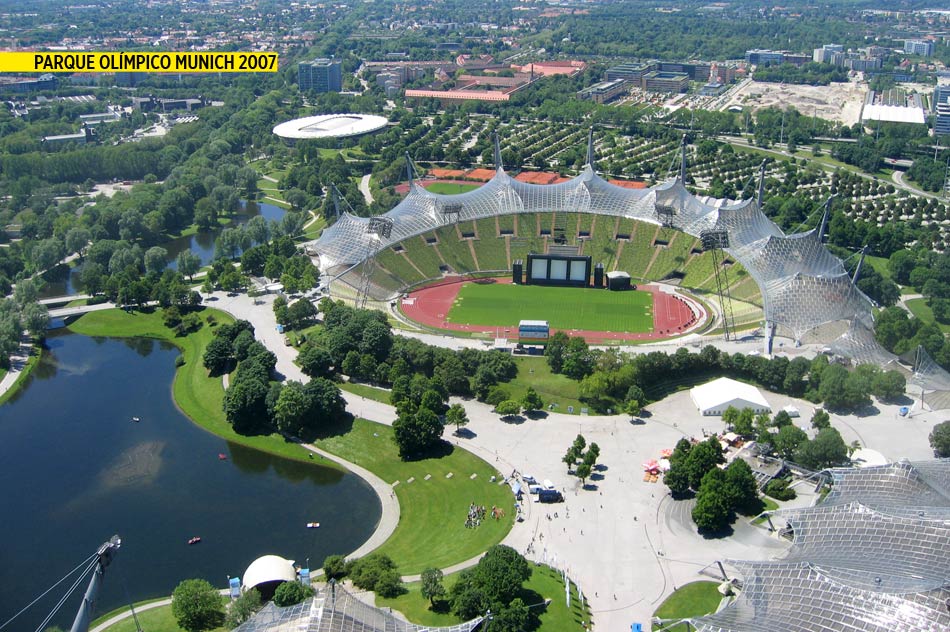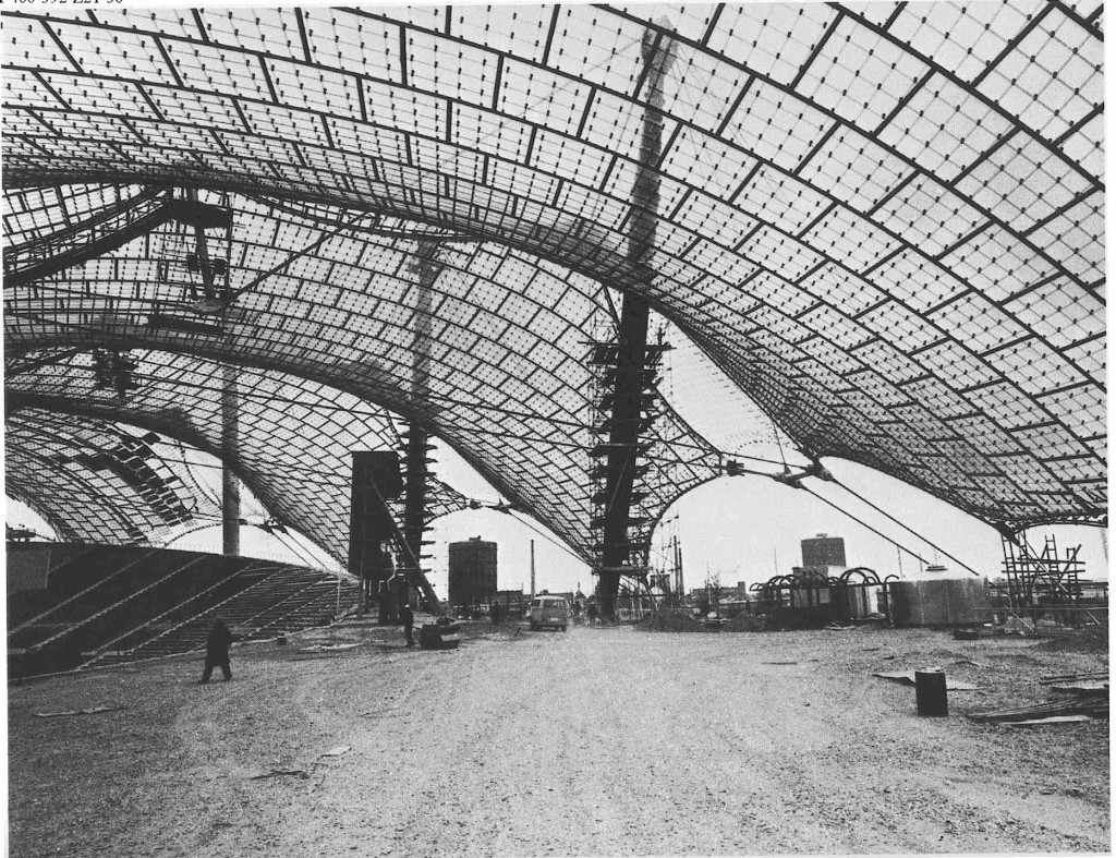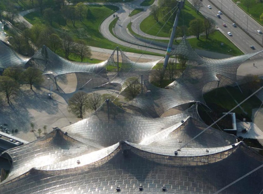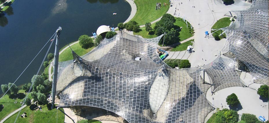 El proyecto, realizado en mayo de 1972, por Günter Behnisch, Frei Otto, y Fritz Leonhardt, para las Olimpiadas de aquel año, comprende una membrana grande para cubrir los soportes del estadio Olímpico, una estructura extensible, una cubierta de tela sobre la piscina Olímpica, y cubiertas hiperbólicas de membrana para unir los edificios y proteger a visitantes de la lluvia y el sol.