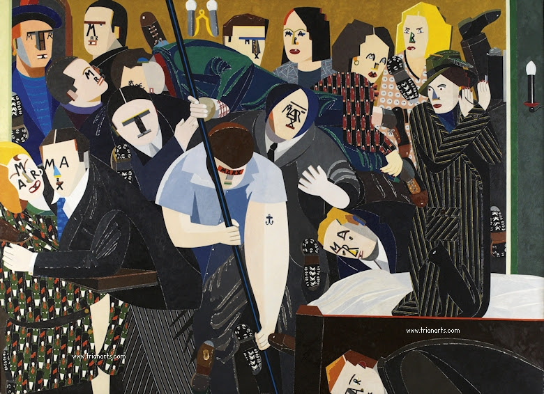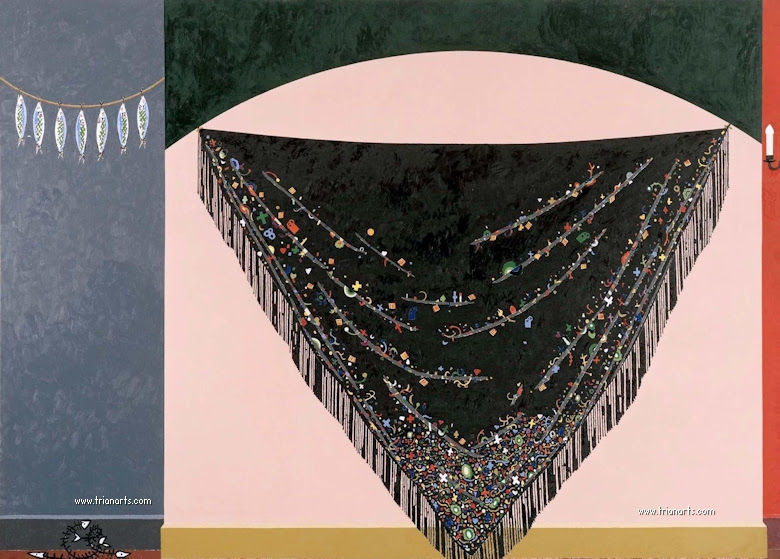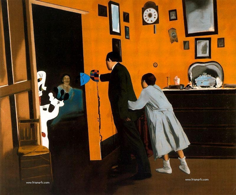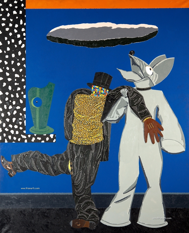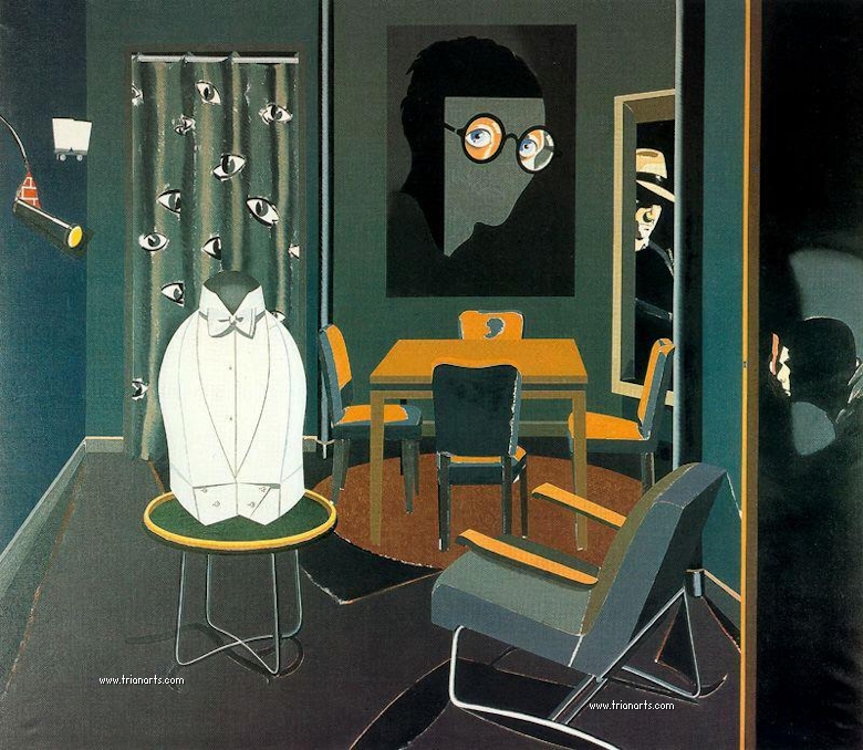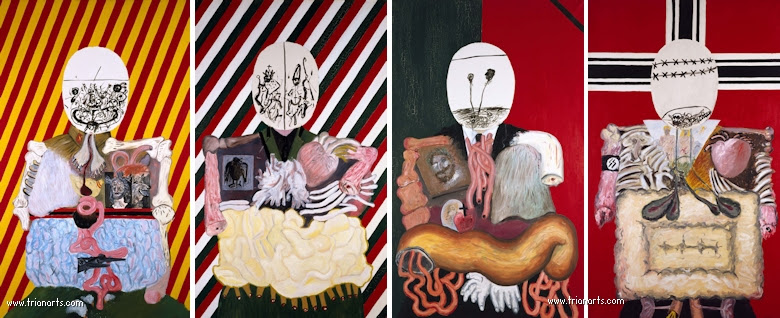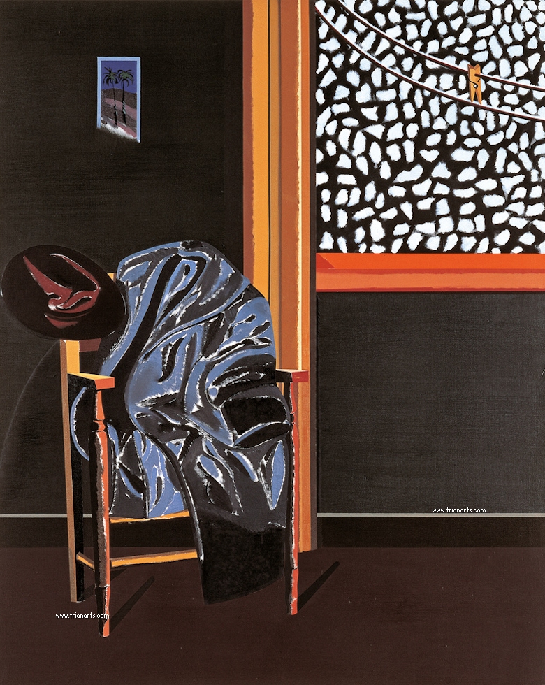 En las dos series que pinta hay ausencia de cuerpos, lo que nos lleva a pensar que son fantasmas, criaturas del exilio que al salir de casa los ha dejado fuera de sitio y de tiempo, criaturas utópicas y anacrónicas…se pinta a si mismo.